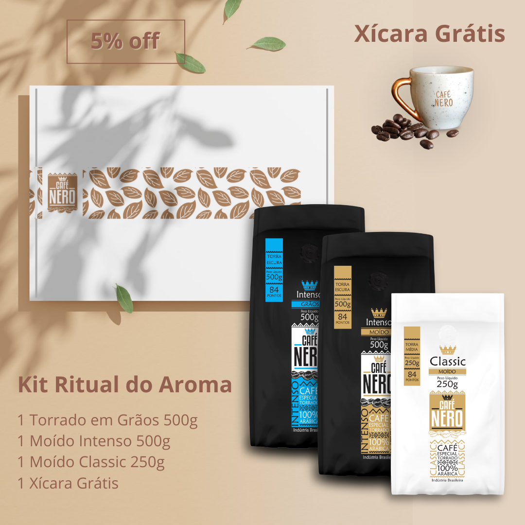 Nosso Kit Café Presenteável Ritual do Aroma, é a escolha ideal para surpreender alguém especial. Proporciona uma experiência ampla de sabores, com nossas linhas Intenso e Classic. Com grãos selecionados, elegância em cada detalhe e sabor inconfundível, é a experiência que transforma qualquer momento em algo único. Seja para comemorar ou apenas para agradar, este kit vai conquistar corações! 🤎
